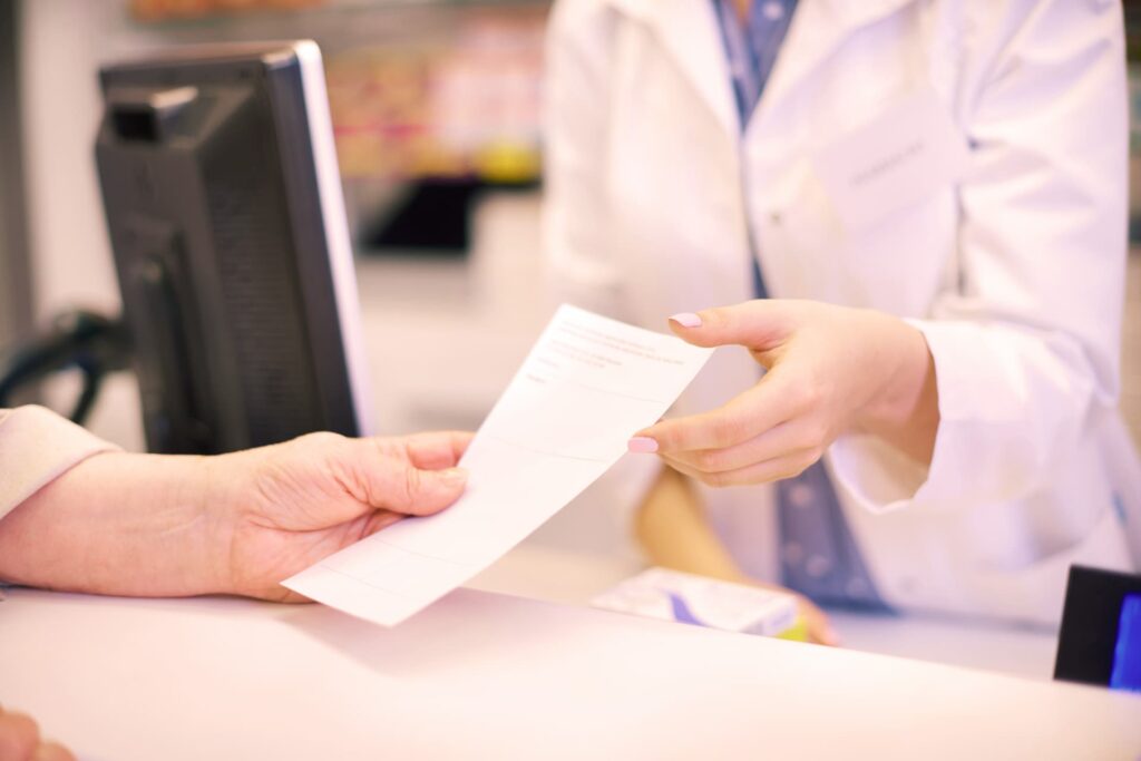 Apothekerin überreicht der Kundin ihre Medikamente